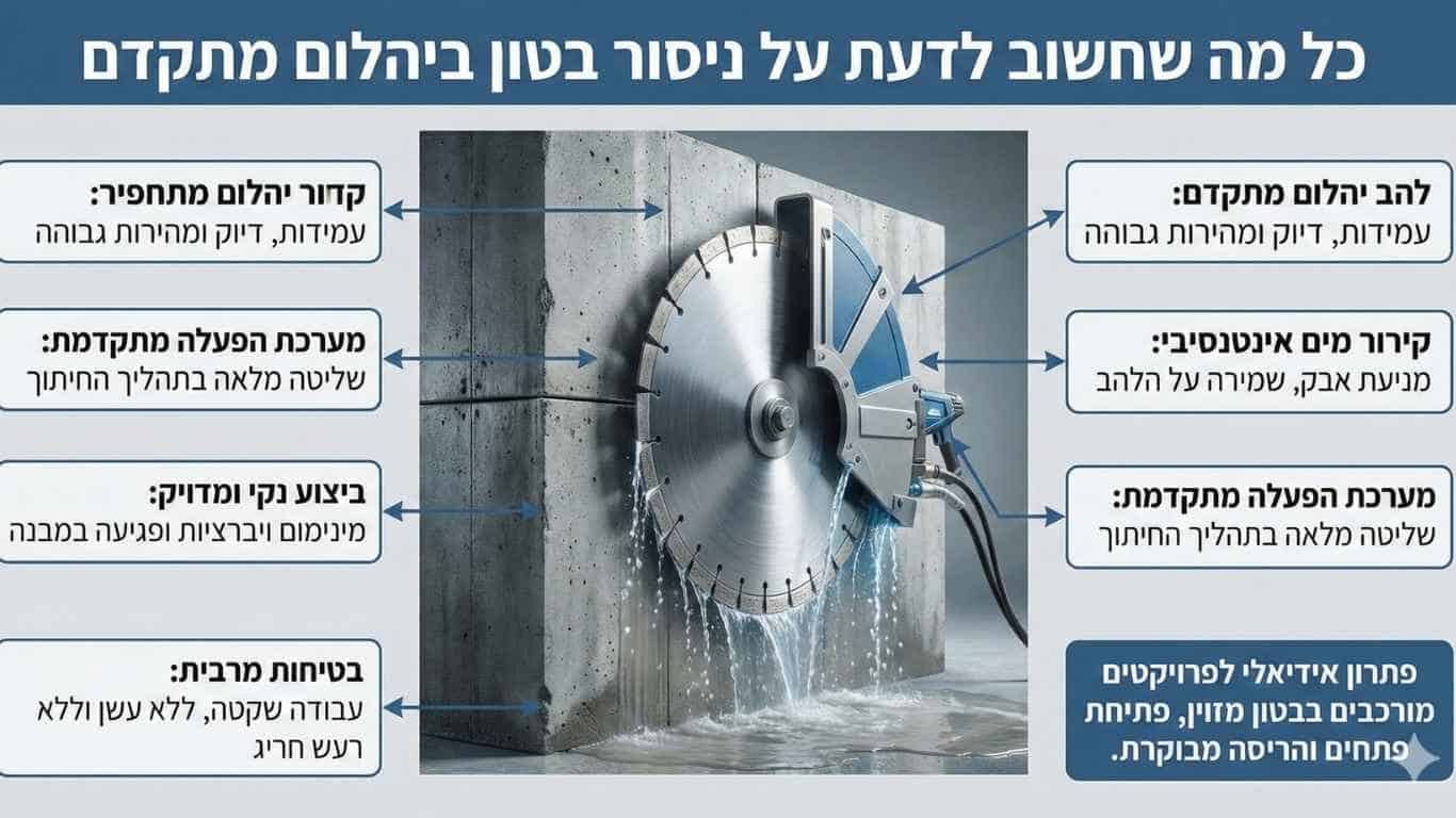 ניסור בטון ביהלום נחשב לשיטה המתקדמת והמדויקת ביותר. דיסק יהלום חותך גם בטון מזוין בעובי גבוה תוך שמירה על קו חיתוך חלק. השיטה מפחיתה רעידות, מגינה על שלמות המבנה ומאפשרת עבודה בסביבה מאוכלסת. בנוסף, ניתן להגיע לרמות גימור גבוהות ללא צורך בשבירה משלימה. חשוב לבחור ציוד מותאם לעובי ולסוג הבטון כדי להבטיח תוצאה בטוחה ויעילה.